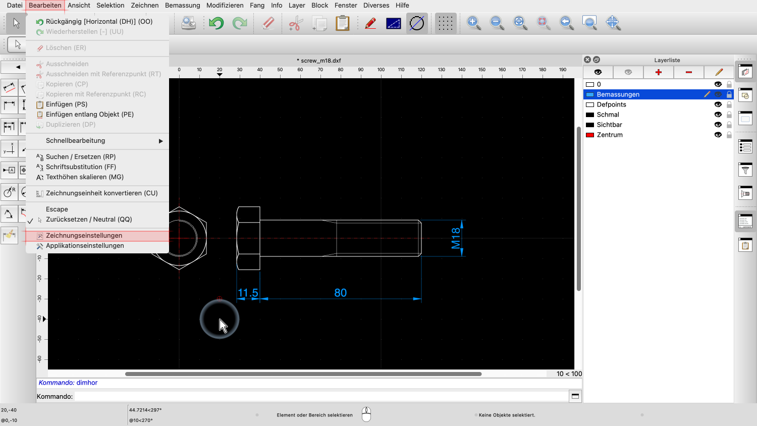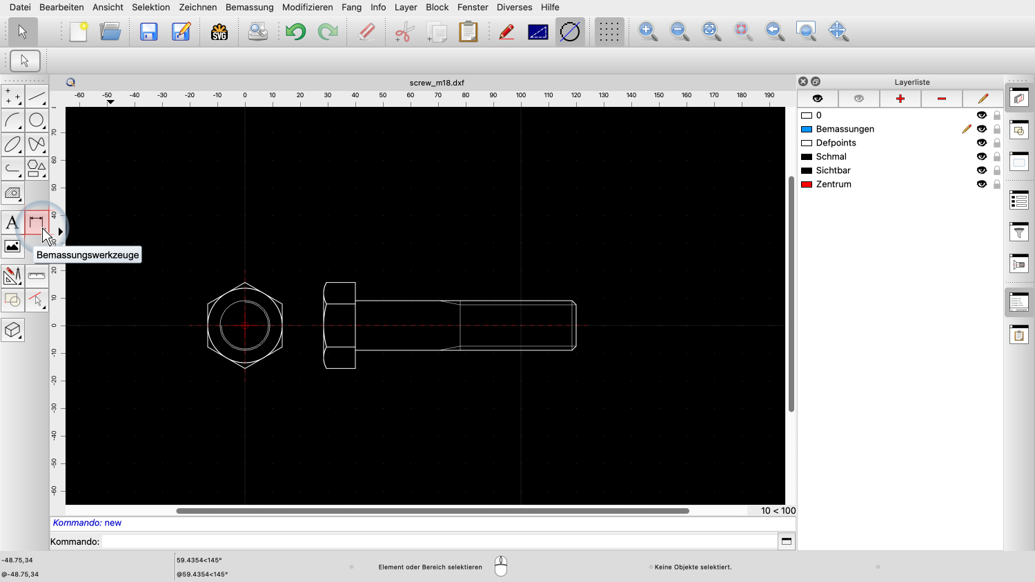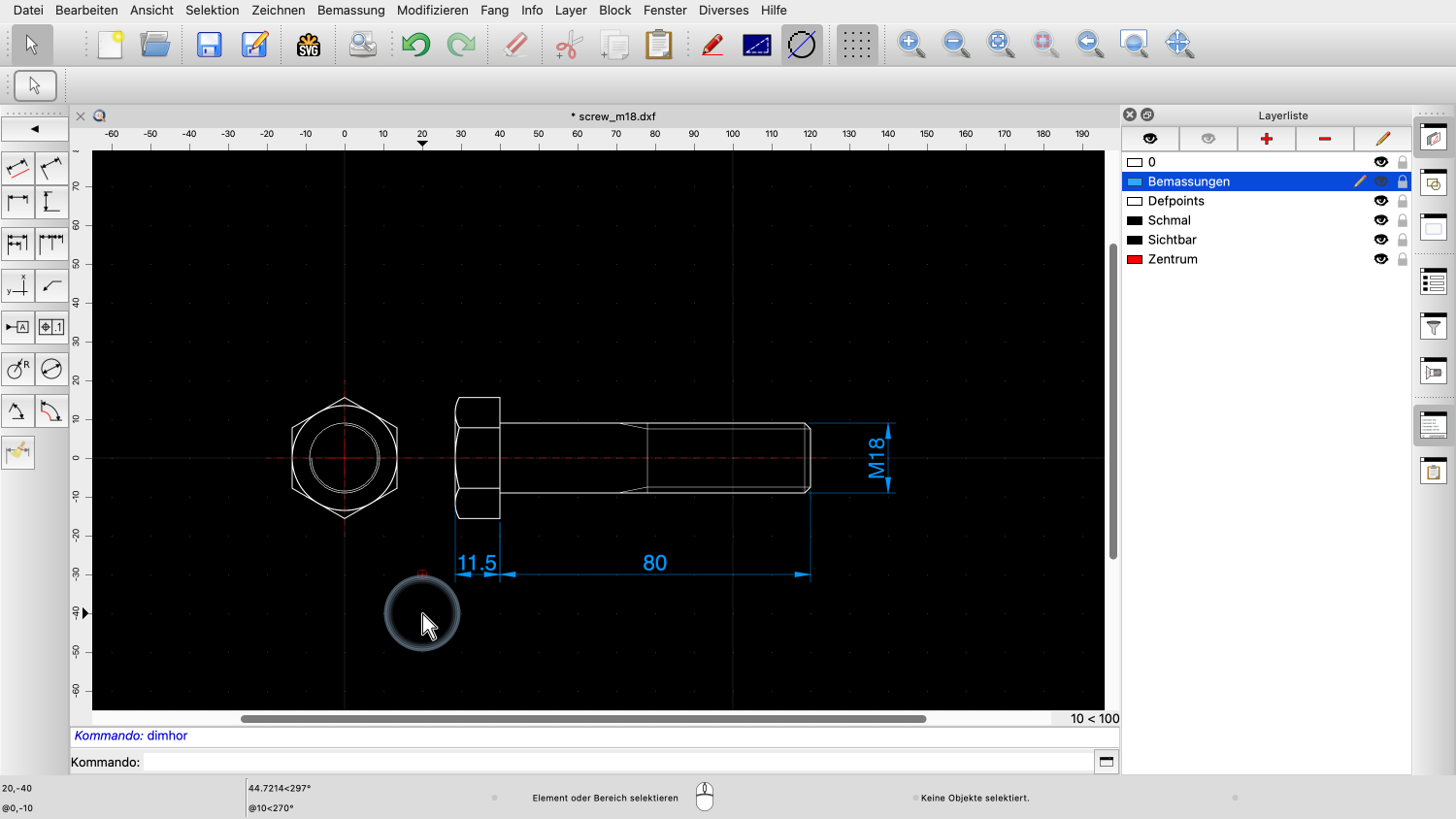 In dieser Zeichnung wollen wir die Beschriftung der Bemassung für den Schraubenkopf verschieben.