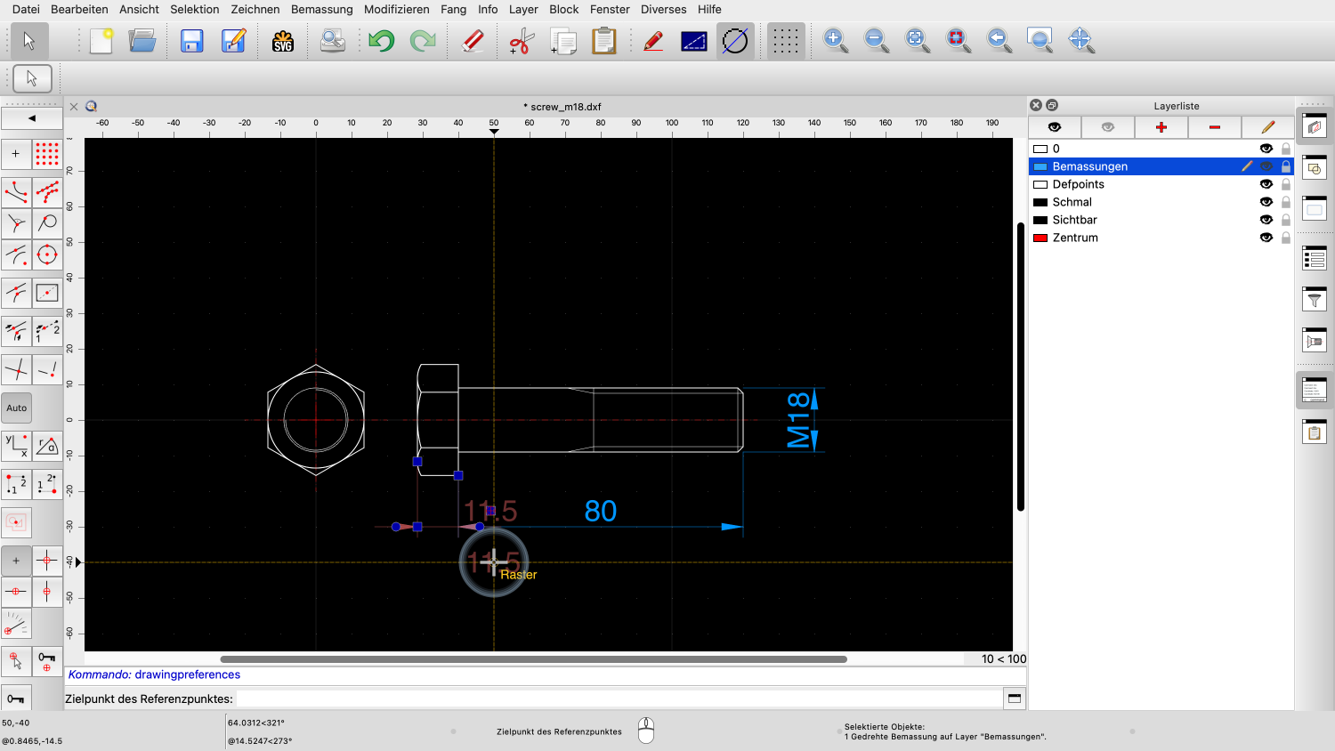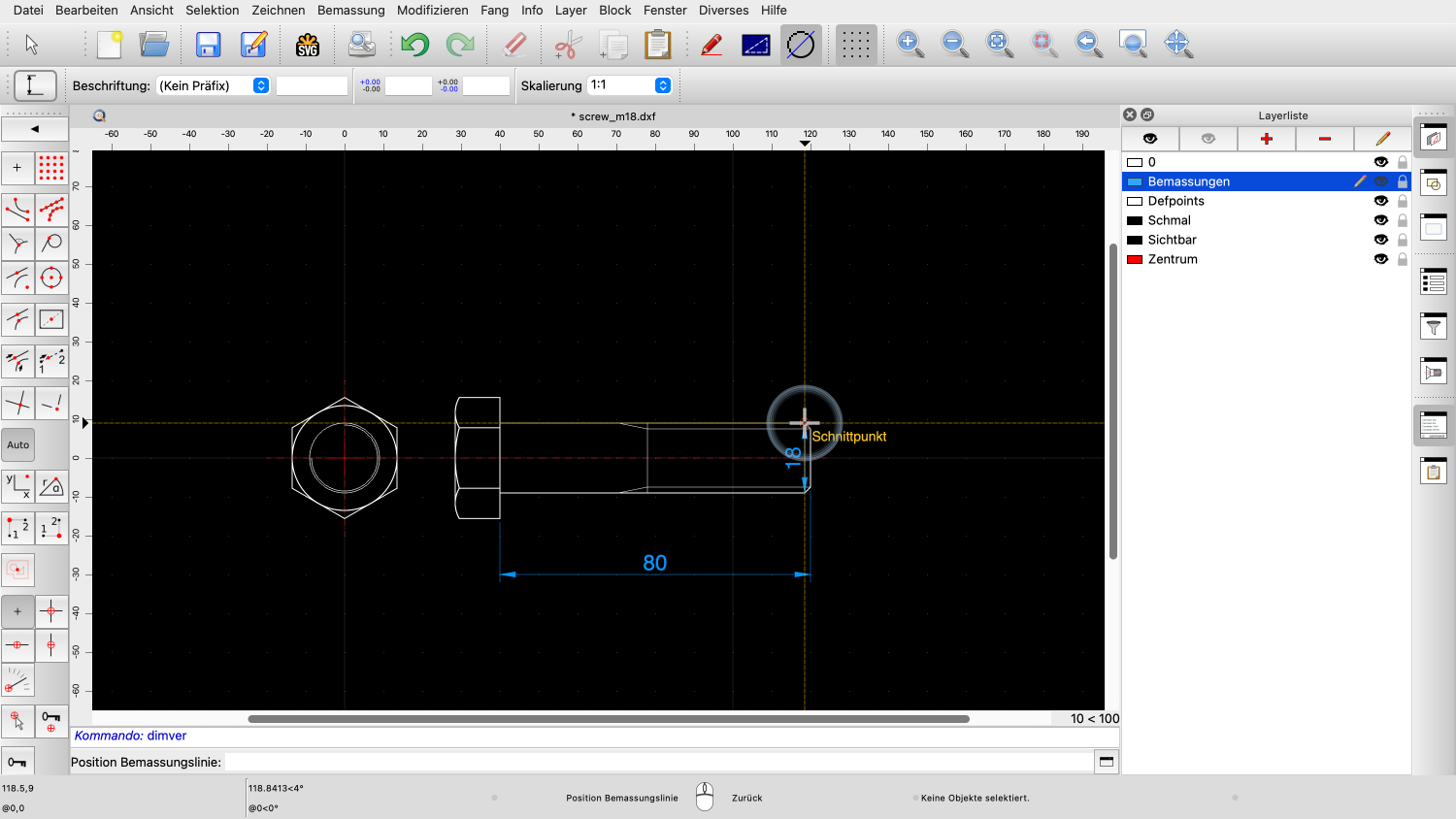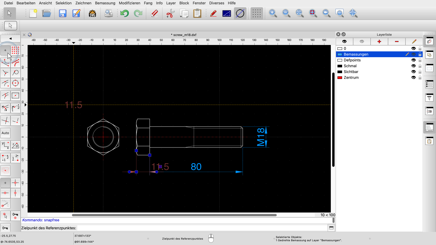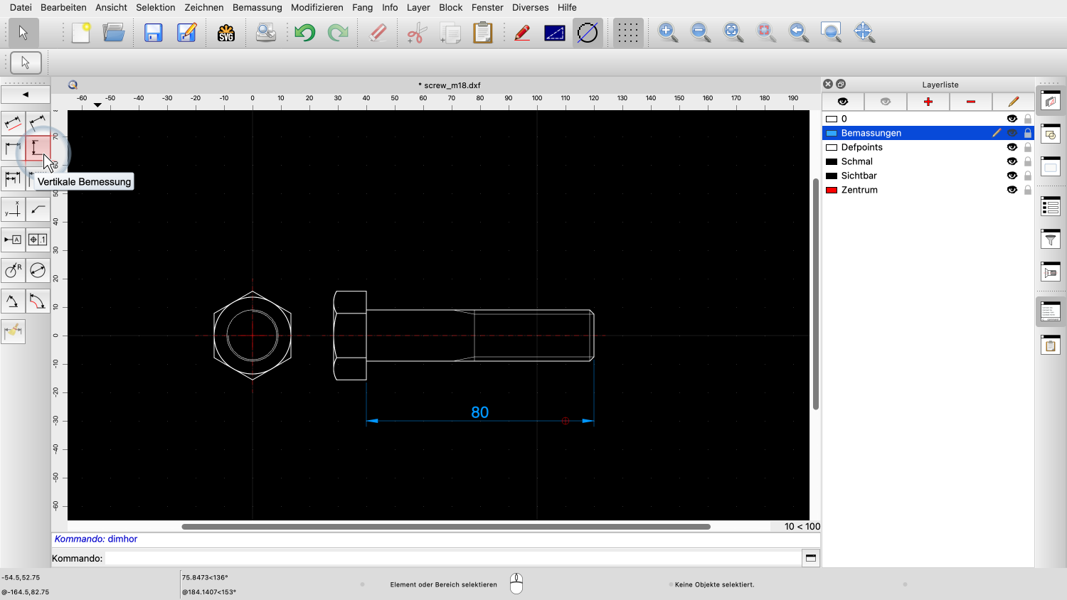 In dieser Zeichnung wollen wir die Beschriftung der Bemassung für den Schraubenkopf verschieben.