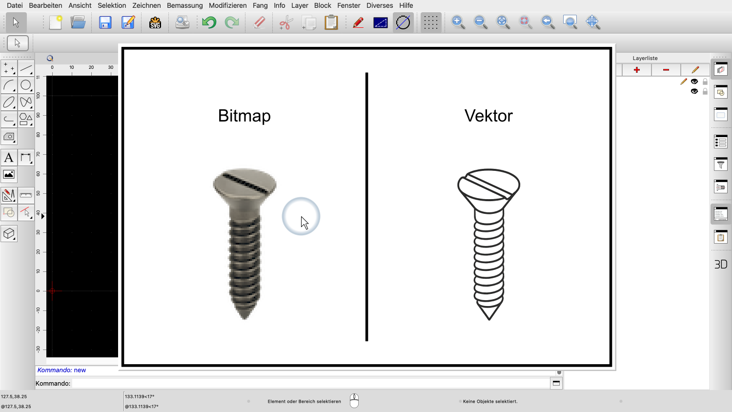 In diesem Beispiel sehen wir eine Bitmap einer Schraube auf der linken Seite und eine Vektorzeichnung derselben Schraube auf der rechten Seite.