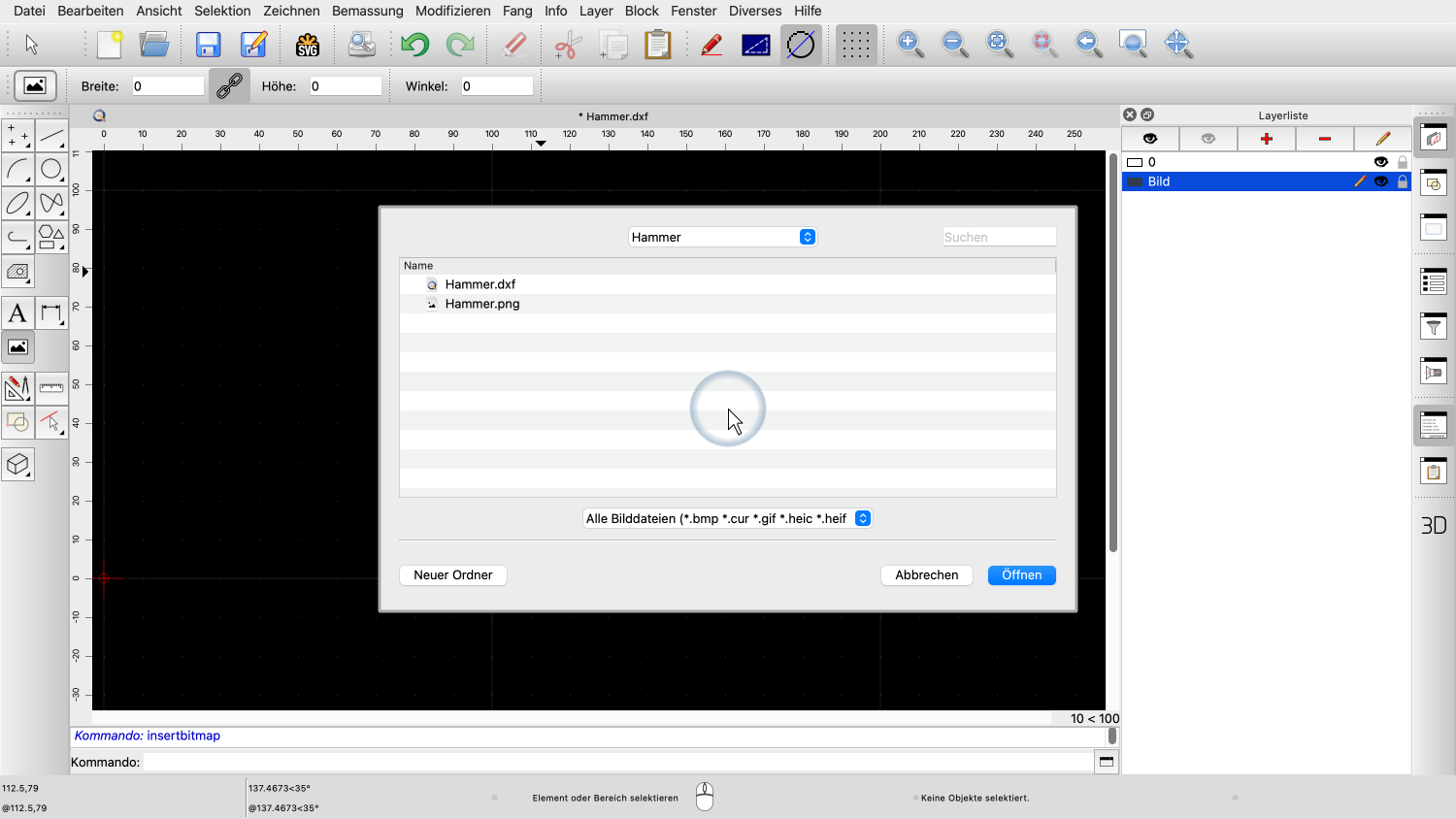 QCAD zeigt den Dateidialog an, damit wir eine Bilddatei zum Einfügen auswählen können.