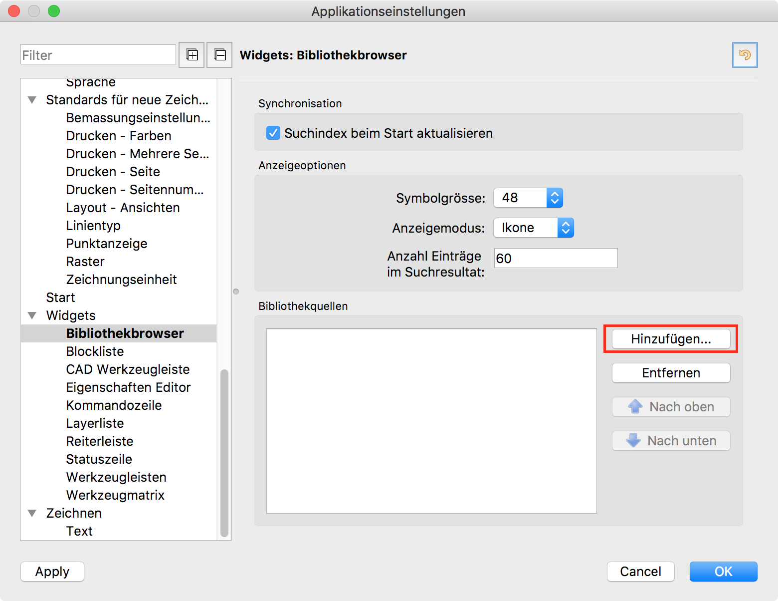 Bearbeiten > Applikationseinstellungen > Widgets > Bibliothekbrowser > Bibliothekquellen > Hinzufügen...