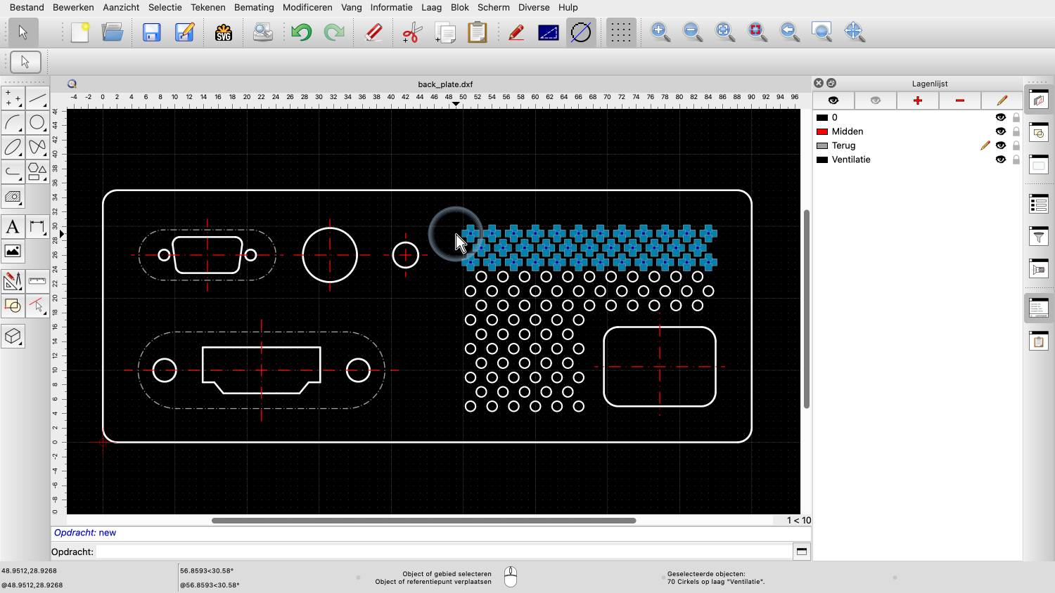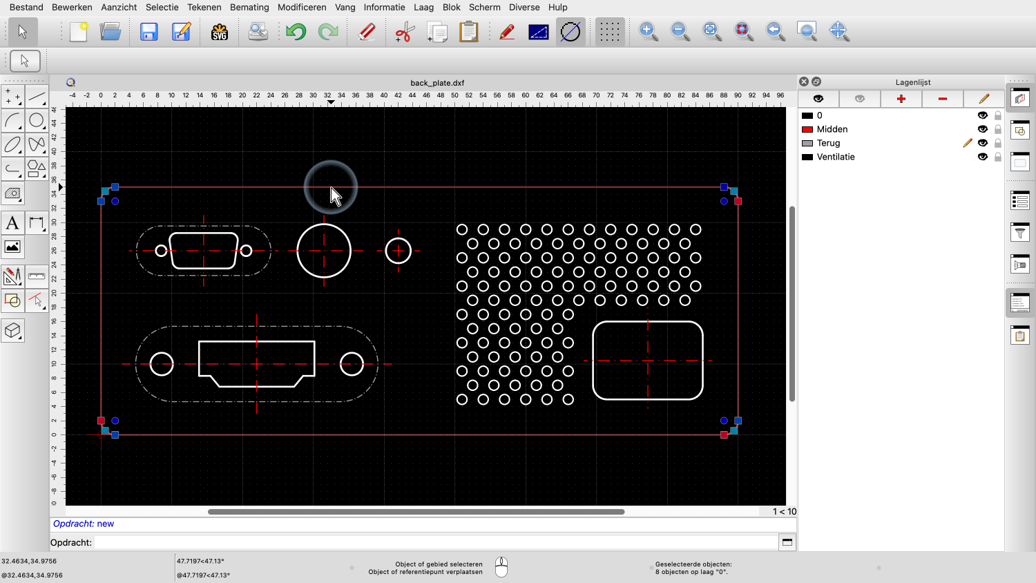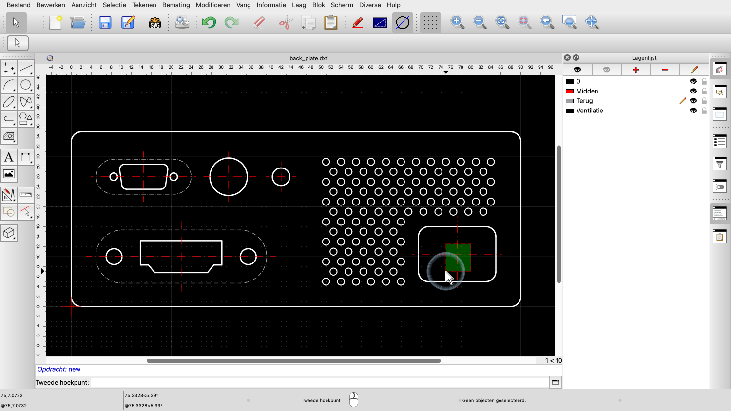 Om de basisselectiegereedschappen van QCAD te demonstreren, bekijken we deze voorbeeldtekening van een achterplaat voor een elektronisch apparaat.