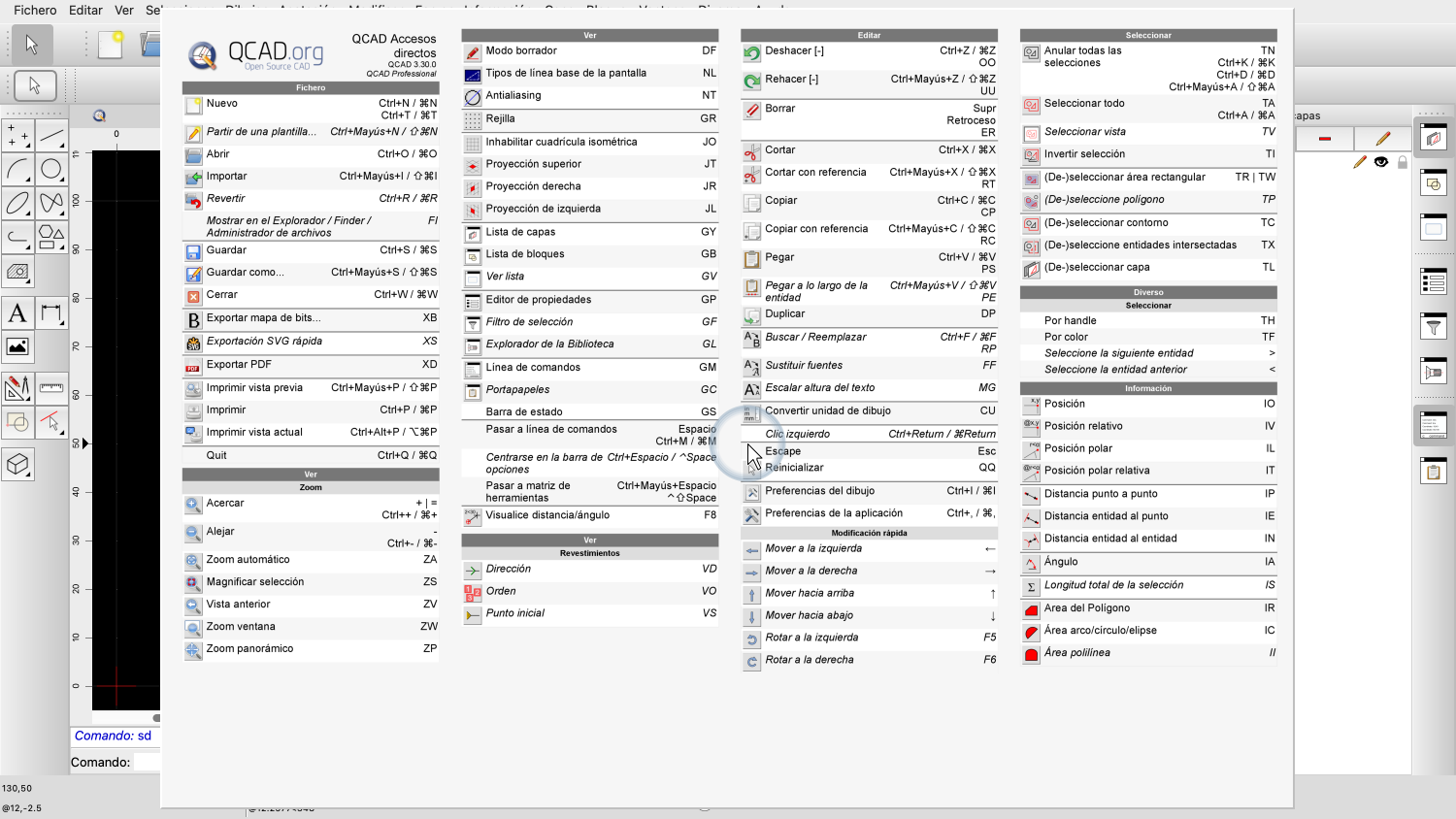 El uso de accesos directos de teclado puede aumentar significativamente la eficacia de la utilización de QCAD.