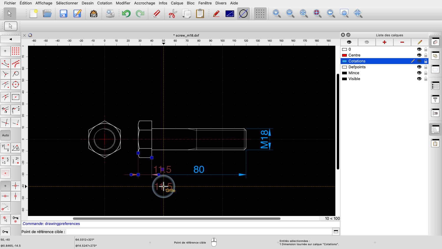 Dans ce dessin, nous voulons déplacer l'étiquette de texte de la cotation de la tête de vis.