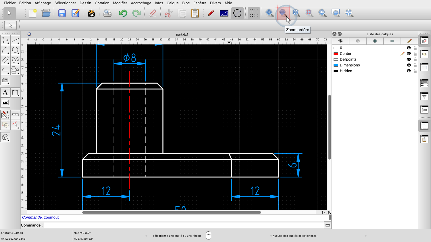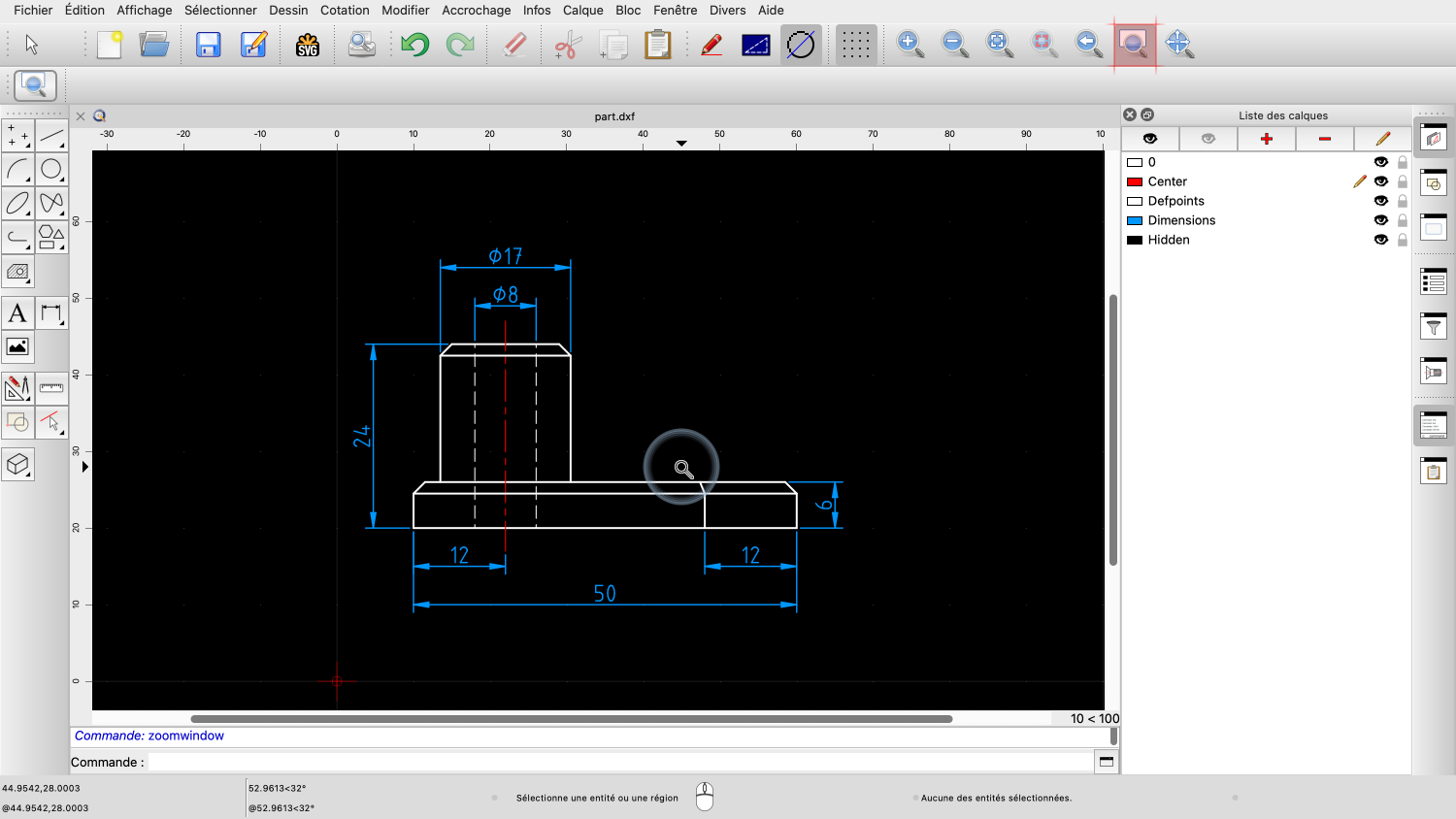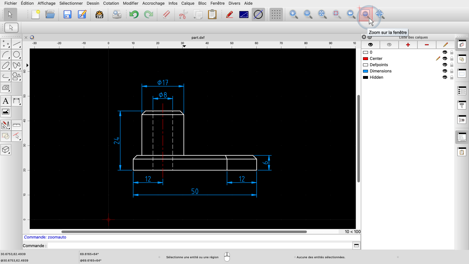 Dès que nous relâchons le bouton de la souris, QCAD zoome sur la zone choisie.