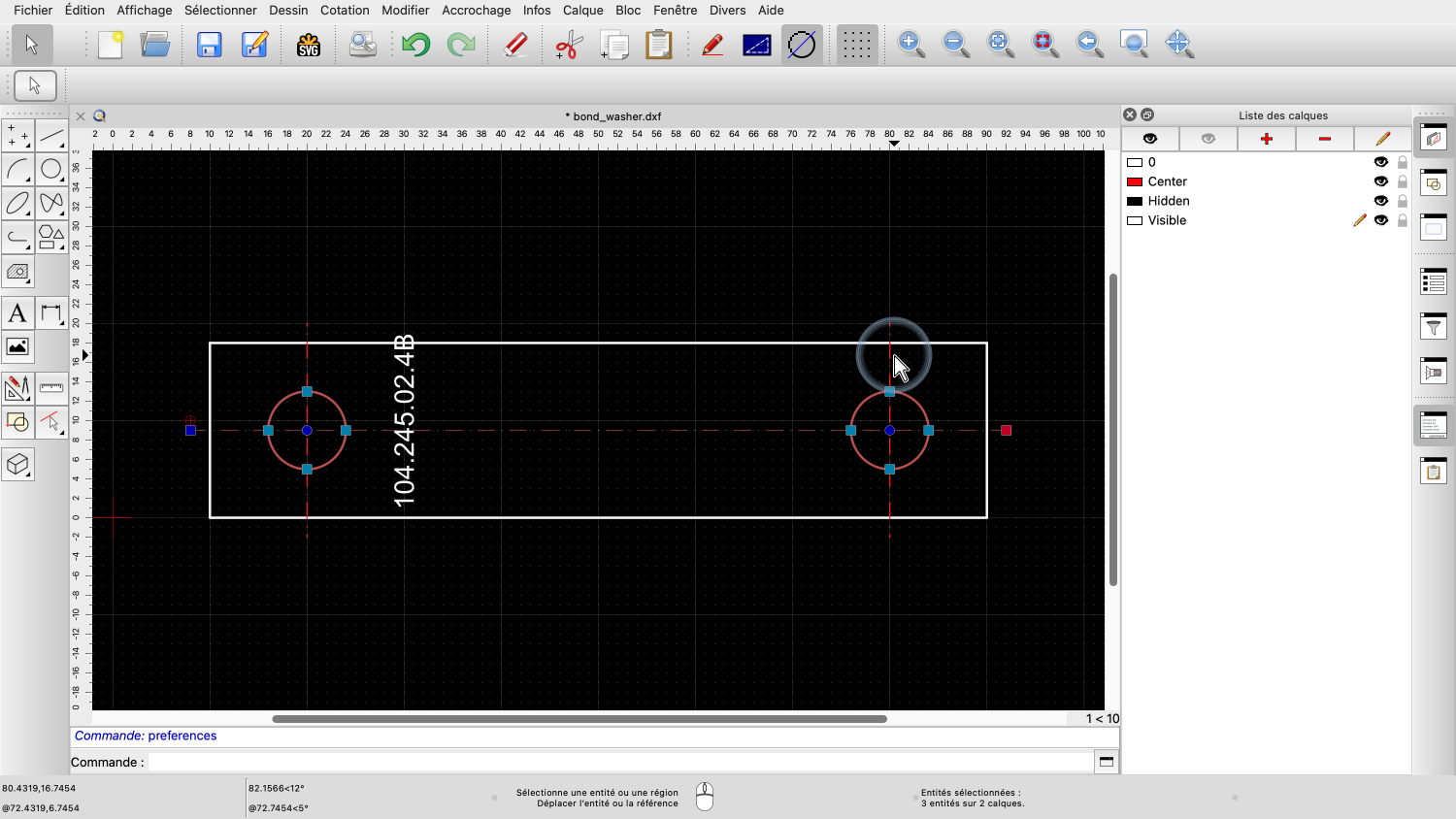 La ligne centrale et les deux cercles sont maintenant sur le presse-papiers QCAD.