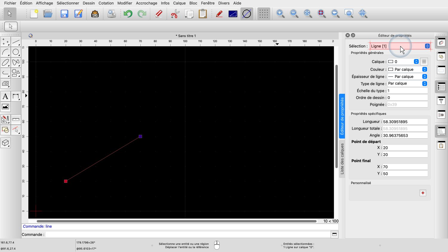 Pour cet exemple, nous dessinons une ligne et la sélectionnons, afin de voir ses propriétés.