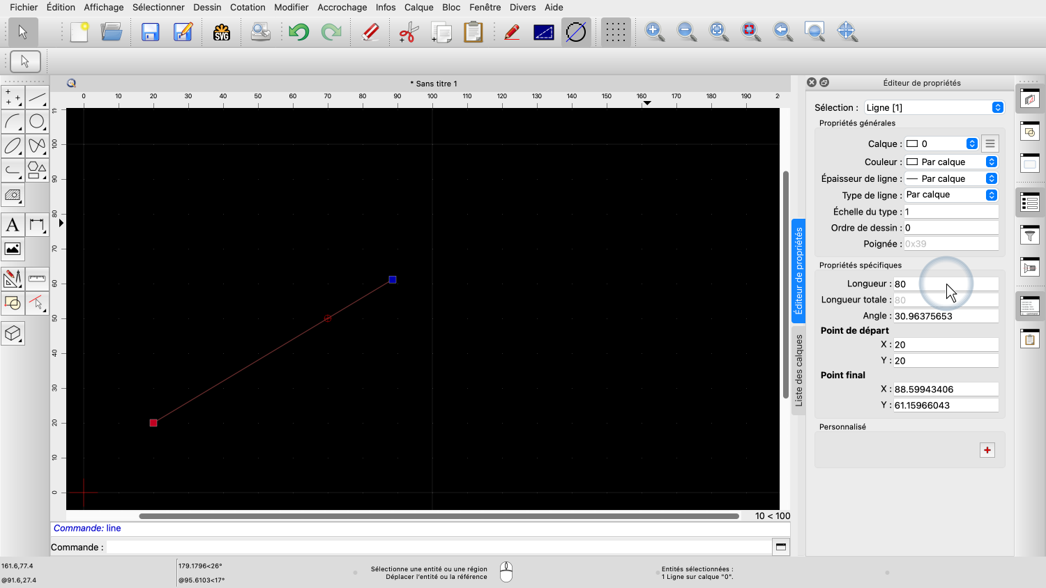 Les autres propriétés comprennent la longueur de la ligne ou son angle, ainsi que les coordonnées du point de départ et du point final.