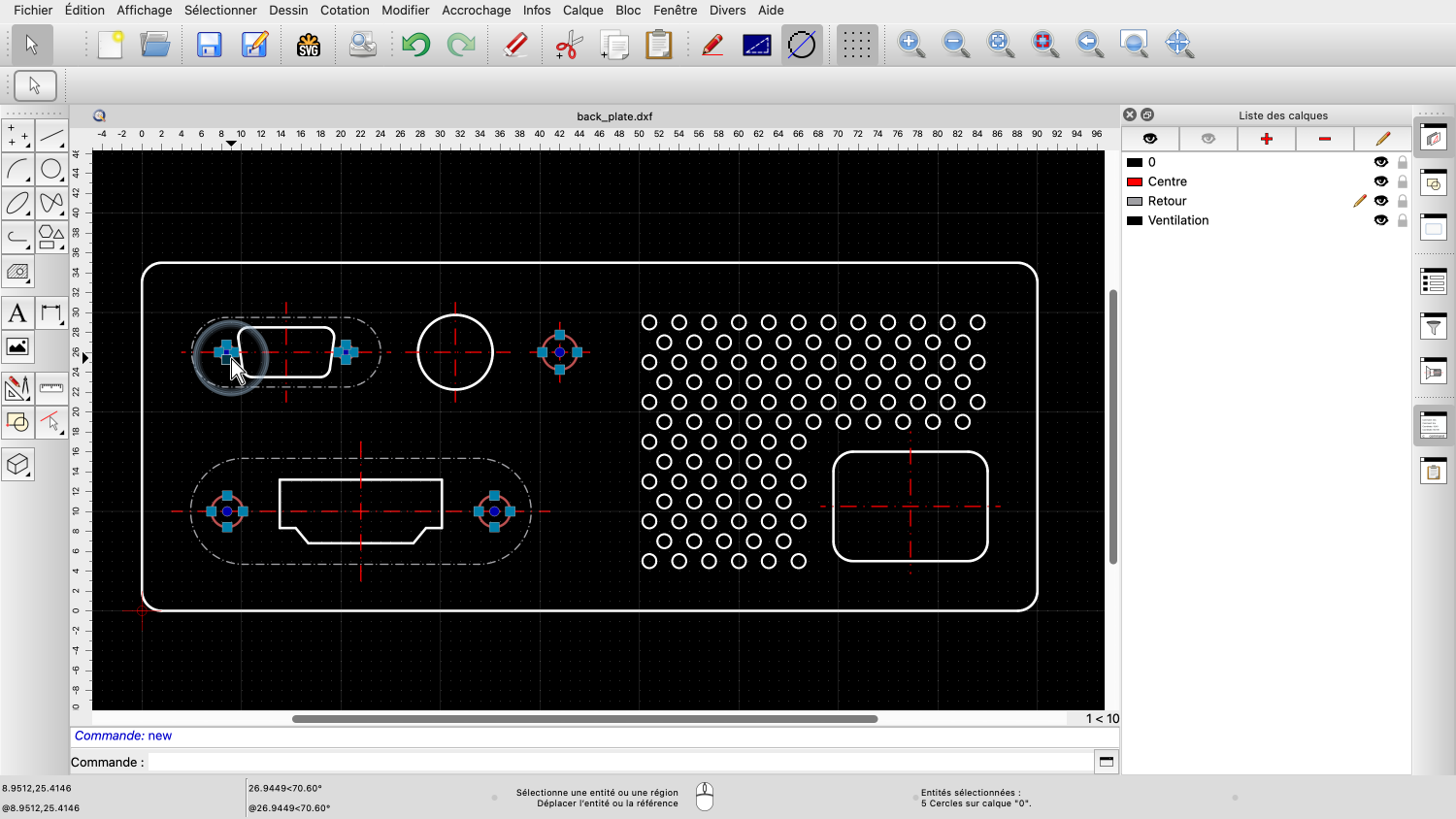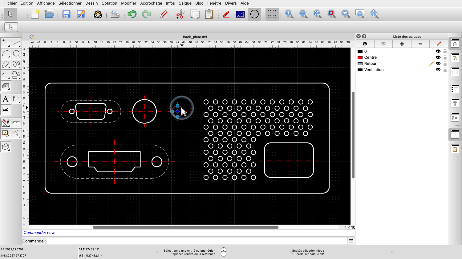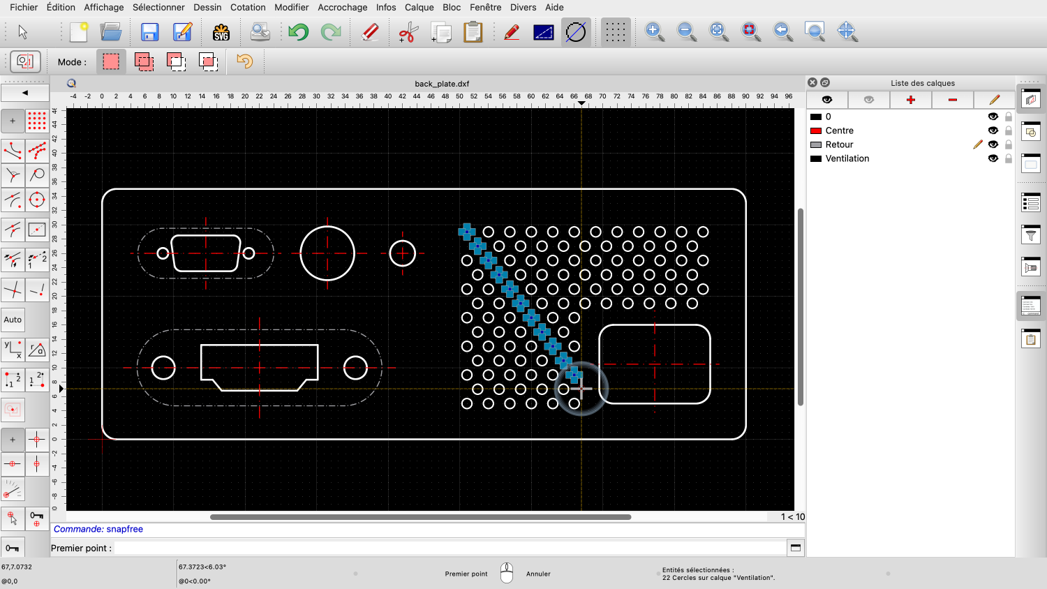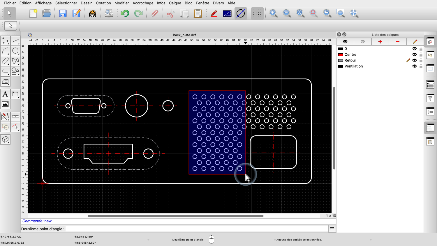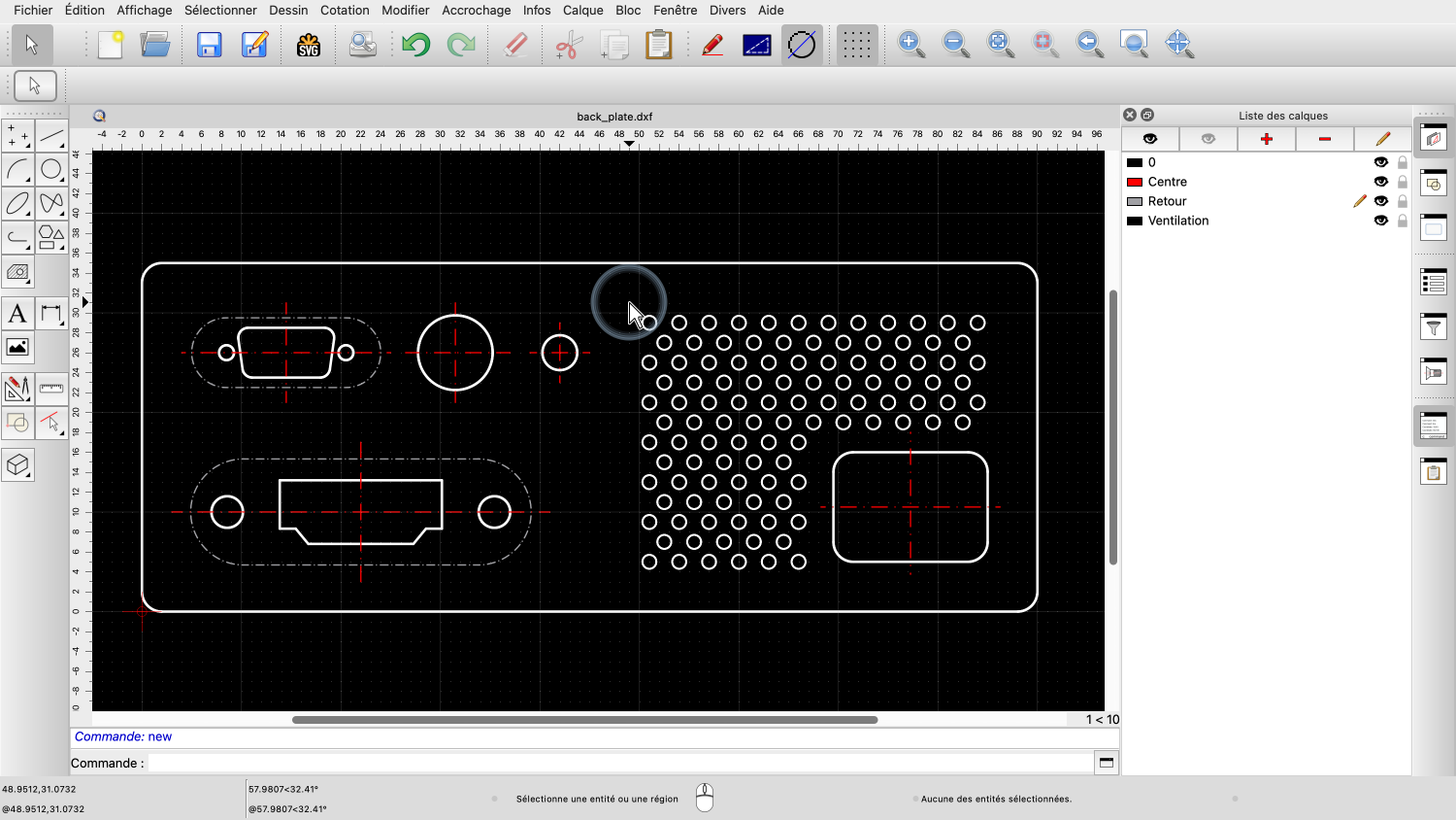 Pour démontrer les outils de sélection de base de QCAD, nous examinons cet exemple de dessin d'une plaque arrière pour un appareil électronique.