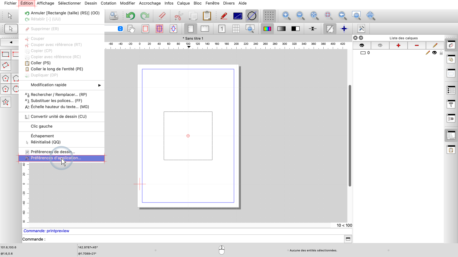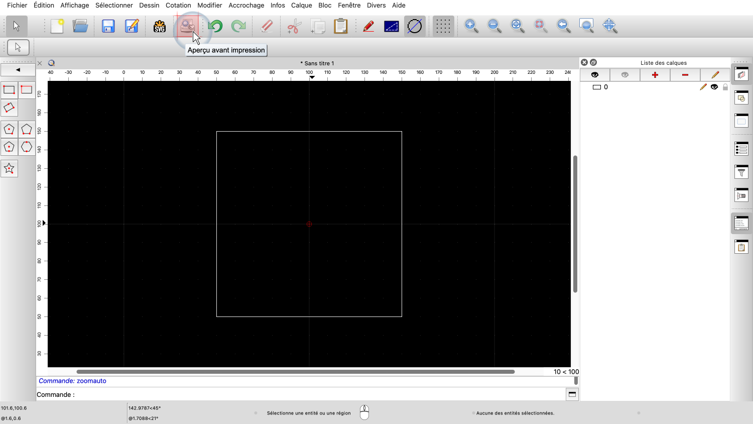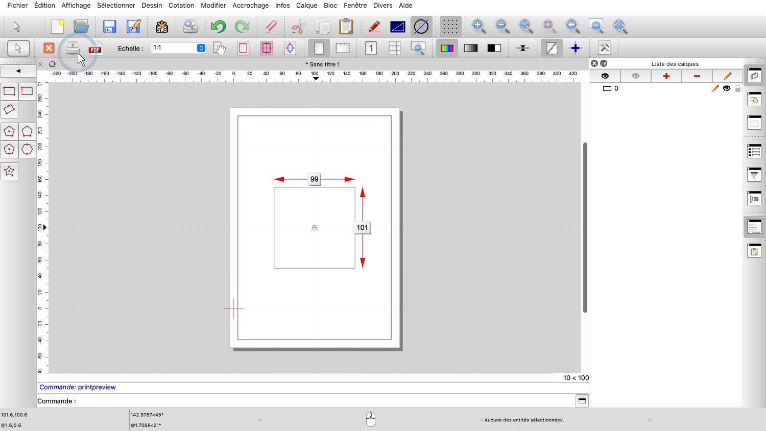Pour calibrer l'imprimante, nous commençons par dessiner un carré simple avec un côté de 100 millimètres.