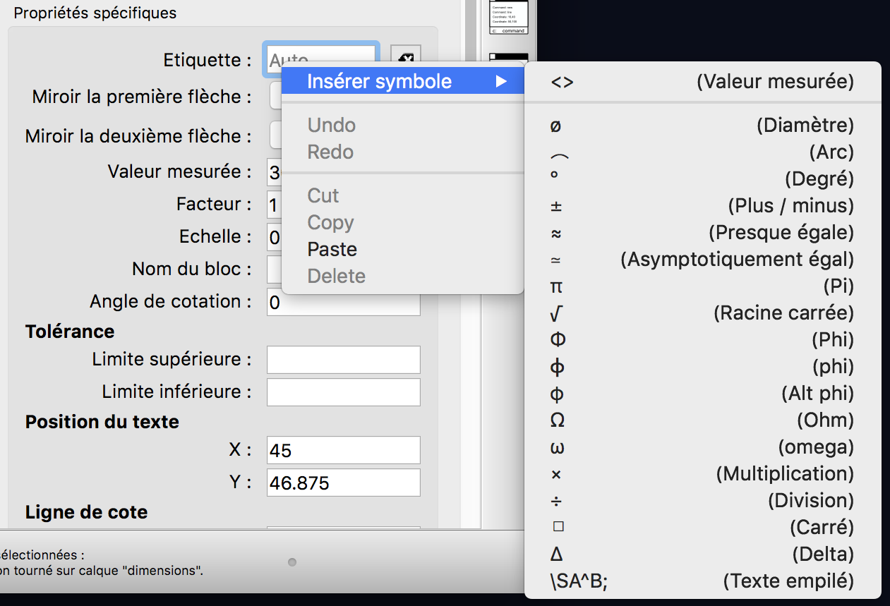 Un clic droit dans le champ de texte de l'étiquette de dimension dans l'éditeur de propriétés affiche un menu contextuel qui peut être utilisé pour insérer rapidement les symboles et le formatage couramment utilisés: