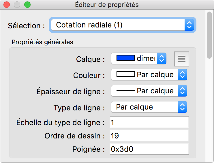 Vous pouvez aussi changer plusieurs entités sélectionnées en même temps en utilisant l'éditeur de propriétés. Pour ajouter un R devant toutes les étiquettes de dimensions radiales, sélectionnez simplement toutes les dimensions radiales et tapez R<> dans la valeur de la propriété étiquette.