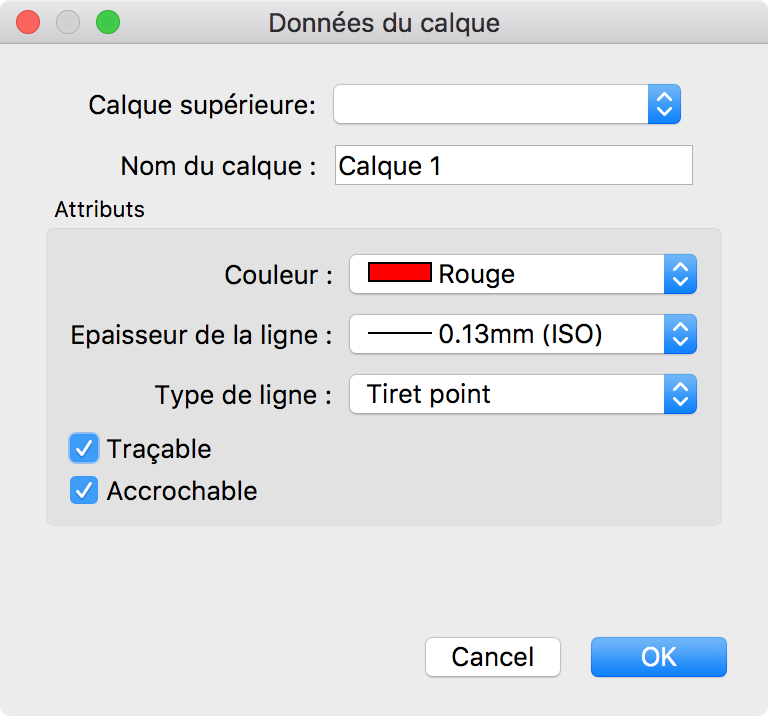 Utilisez l'outil Calque > Ajouter un calque pour créer un nouveau calque. Appelez le calque "Calque 1" et donnez-lui une couleur (rouge), une épaisseur de ligne (0.13mm) et un type de ligne (tiret point) :