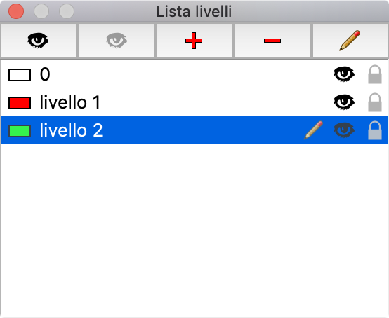 La lista dei livelli mostra tutti i livelli del disegno in uso. Mostra inoltre quale livello è attivo al momento - ossia su quale livello si sta lavorando. I livelli possono essere aggiunti, cancellati, attivati / non attivati, ecc. nella lista.