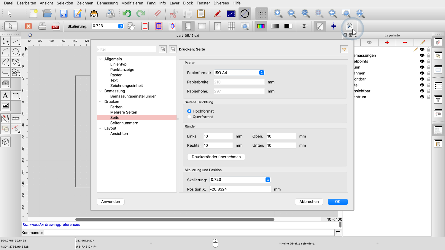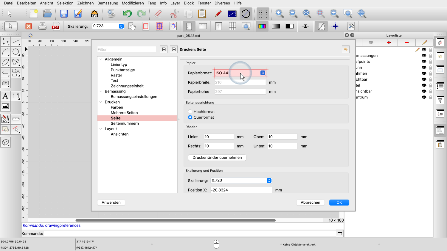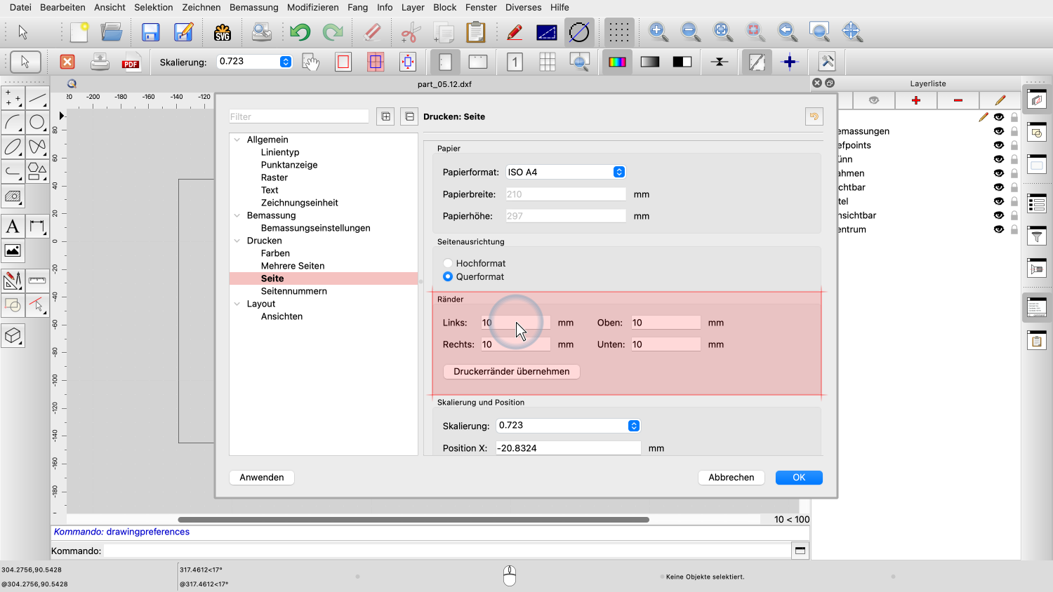 Die Seitenränder sind auf 10 Millimeter eingestellt, was für diese Zeichnung in Ordnung ist.