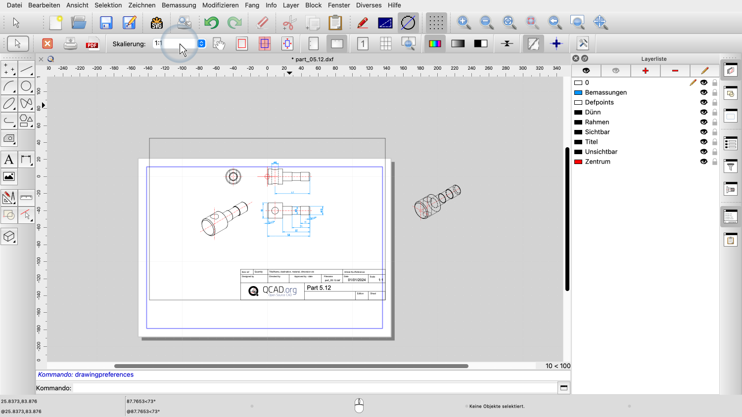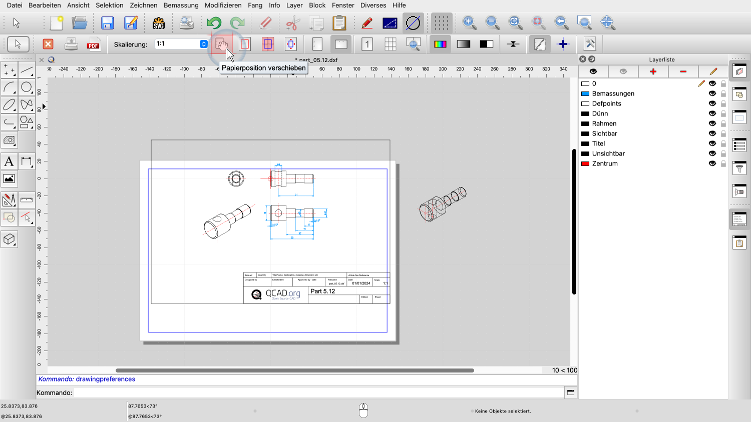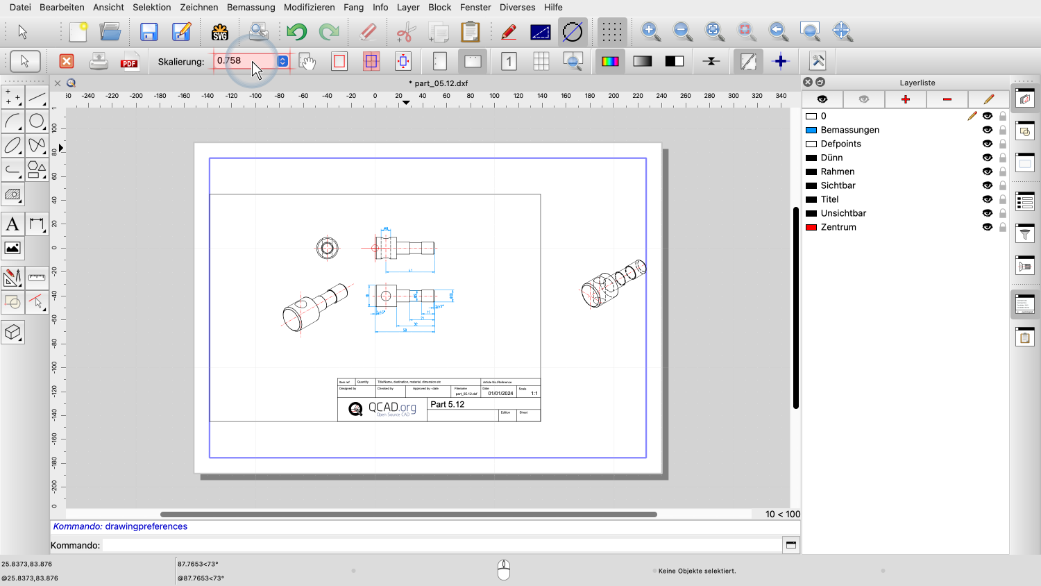 Wir haben QCAD lediglich mitgeteilt, wie wir die Zeichnung für den Druck auf dem Papier skalieren und positionieren wollen.