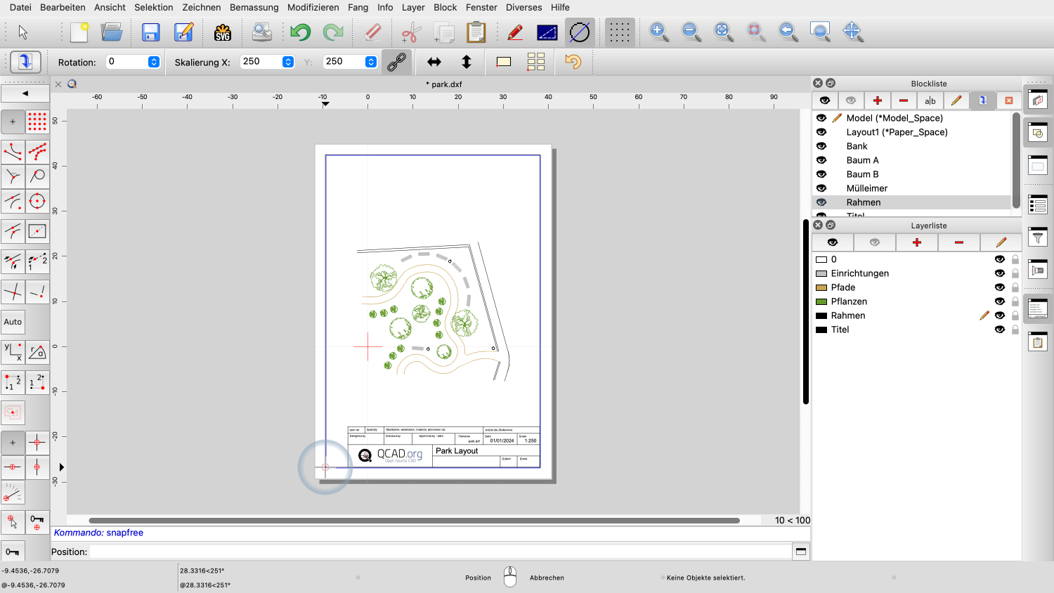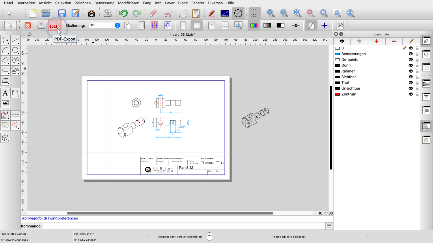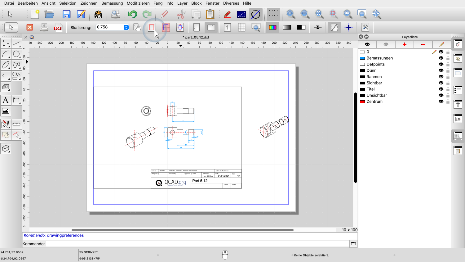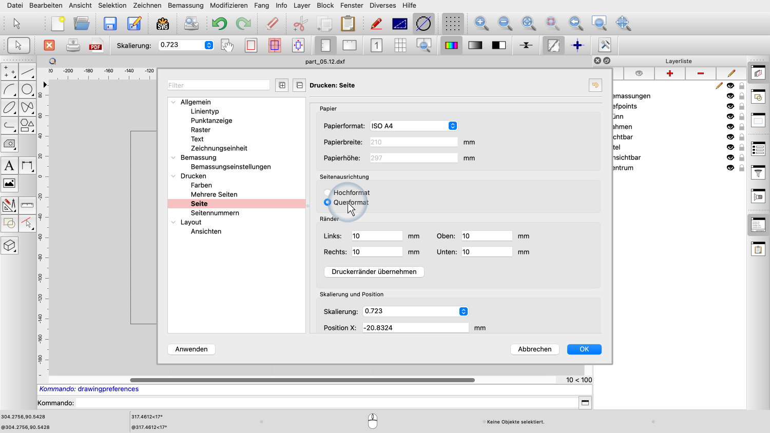 Wir haben QCAD lediglich mitgeteilt, wie wir die Zeichnung für den Druck auf dem Papier skalieren und positionieren wollen.