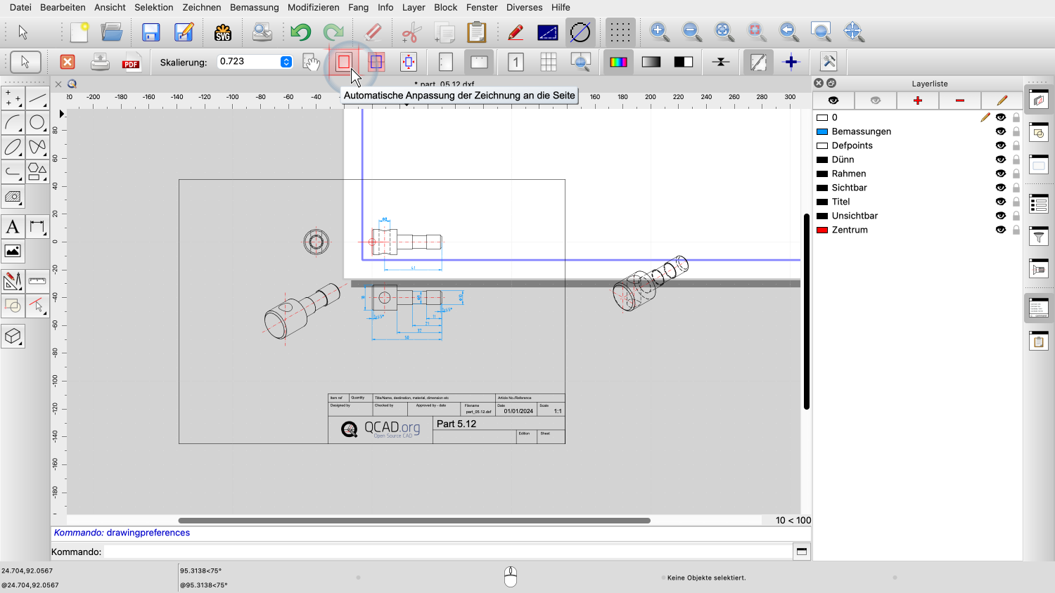 Die automatische Anpassung passt den Zeichnungsmassstab und die Position so an, dass alle Objekte mit den Rändern, die wir in den Seiteneinstellungen festgelegt haben, auf die Seite passen.