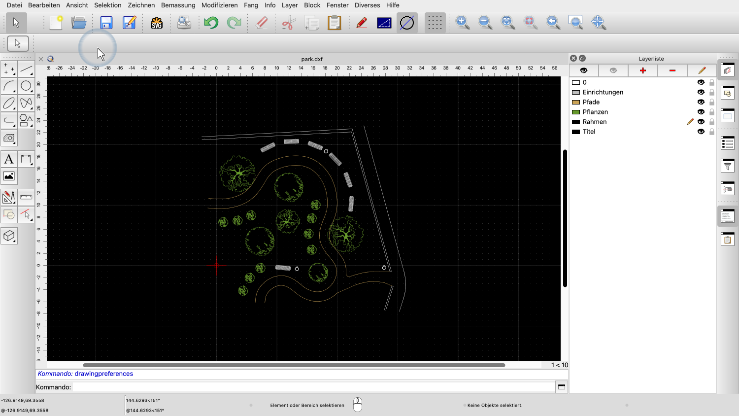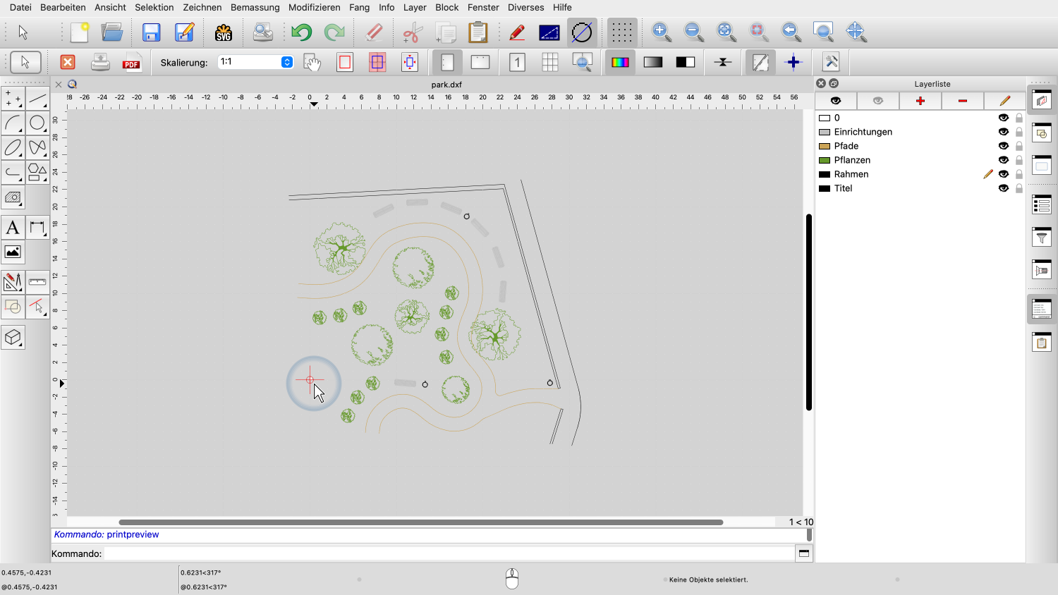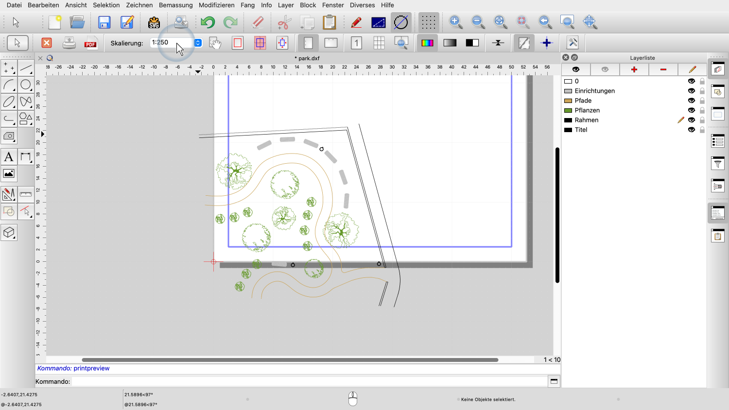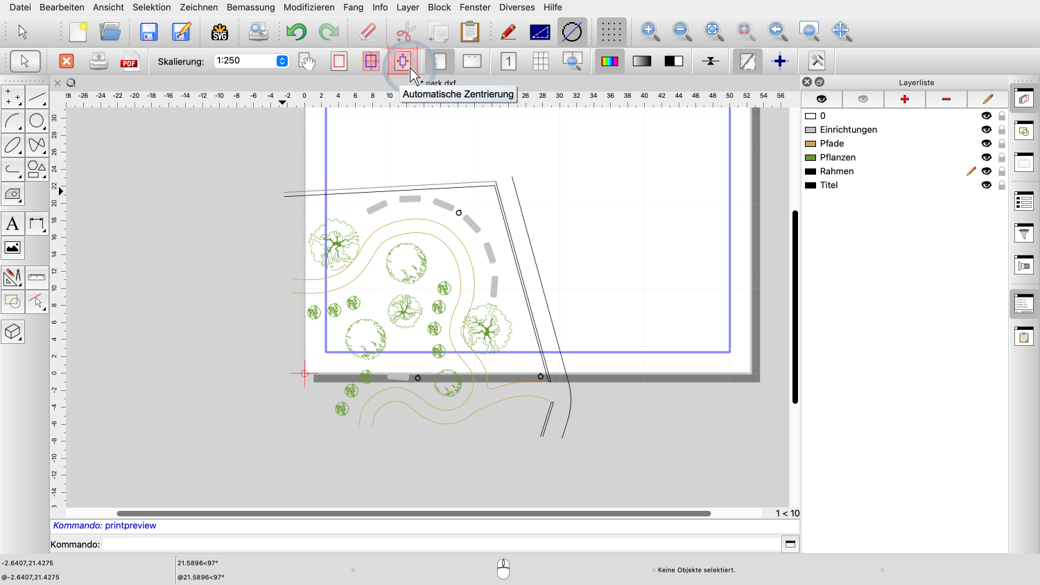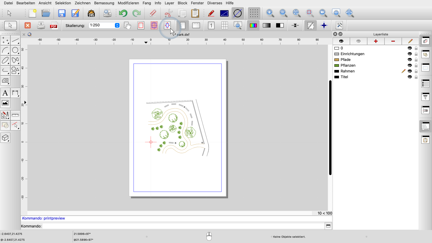 Um unsere Zeichnung für den Druck vorzubereiten, wechseln wir zunächst in die Druckvorschau.