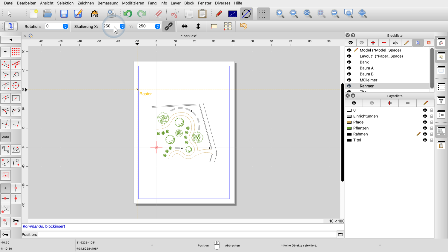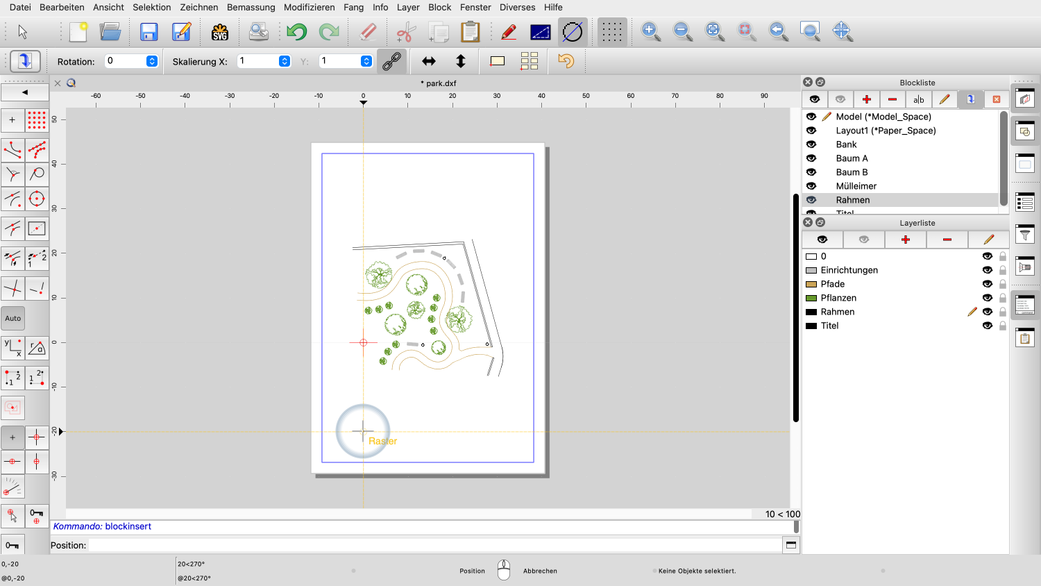 Wir haben bereits einen Zeichnungsrahmen in einem separaten Block namens "Rahmen" vorbereitet.